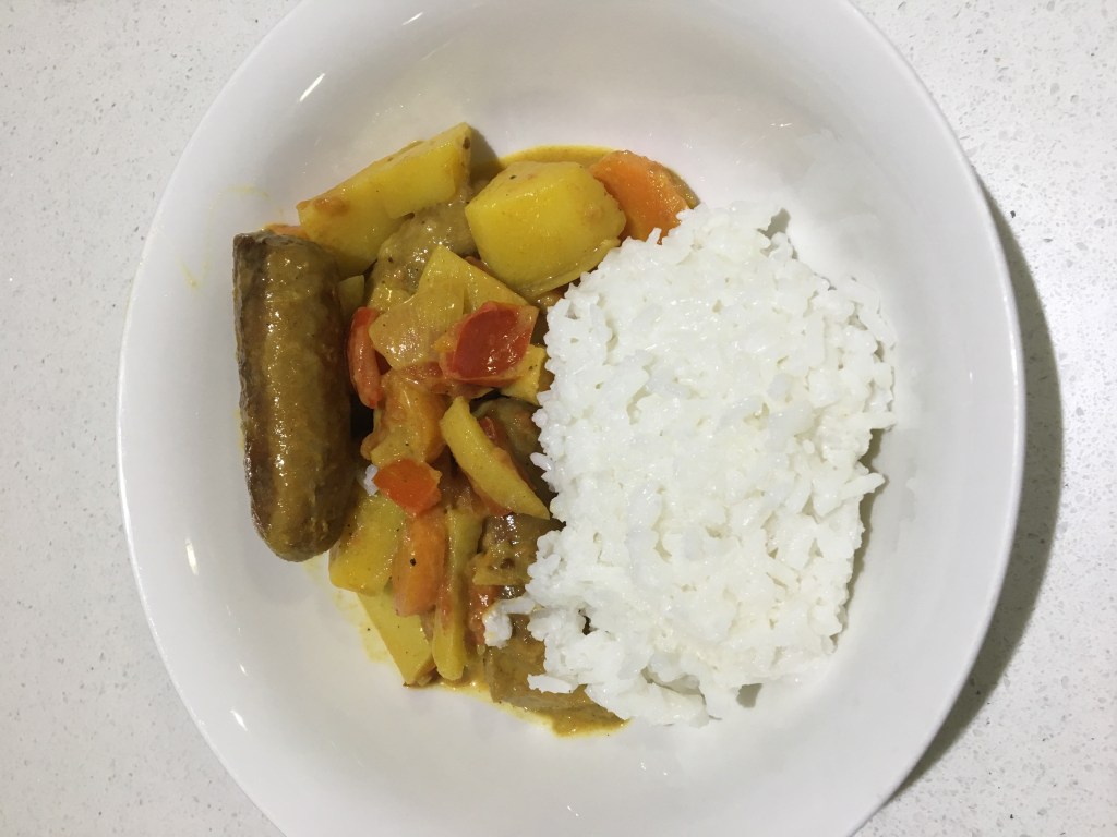 - Add curry powder and until the sausages and veg are coated. Add the stock and tomatoes and mix well. Allow to simmer.