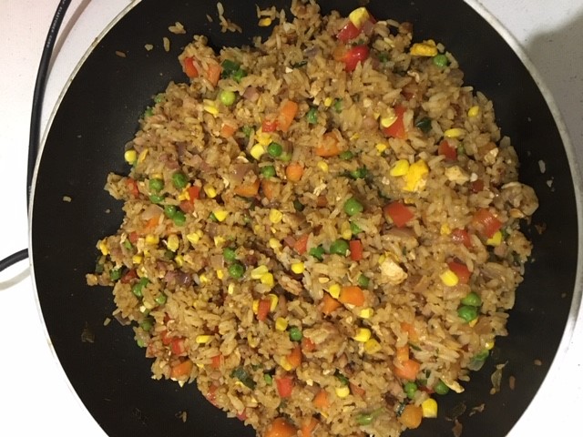 - Put the rice and soy sauce into the wok with the vegetables. Combine well.